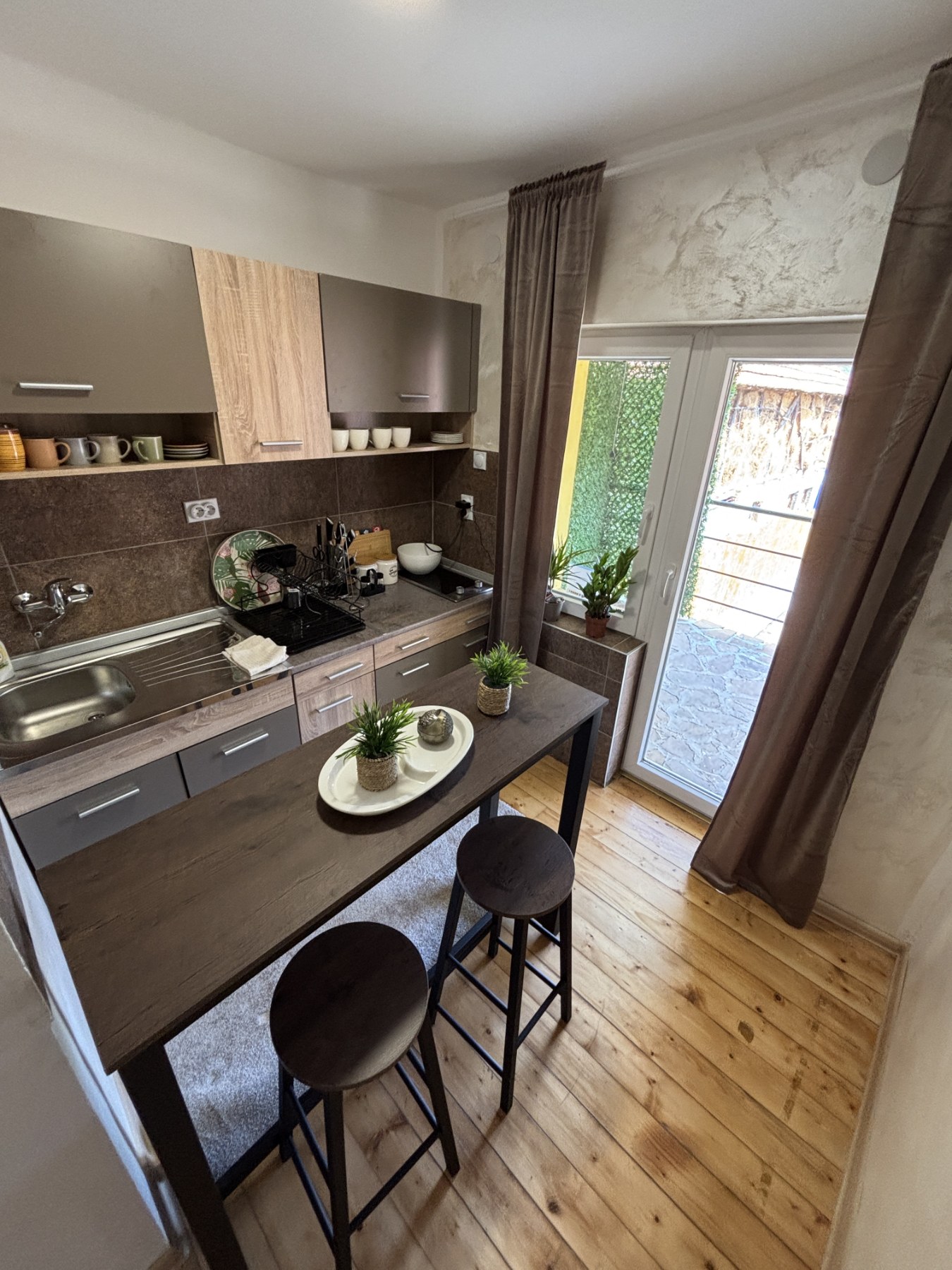 Posebna kuhinja koja ima sve osnovne elemente i uređaje. Takođe ima izlaz na terasu sa koje se prostire predivan pogled na dvorište .